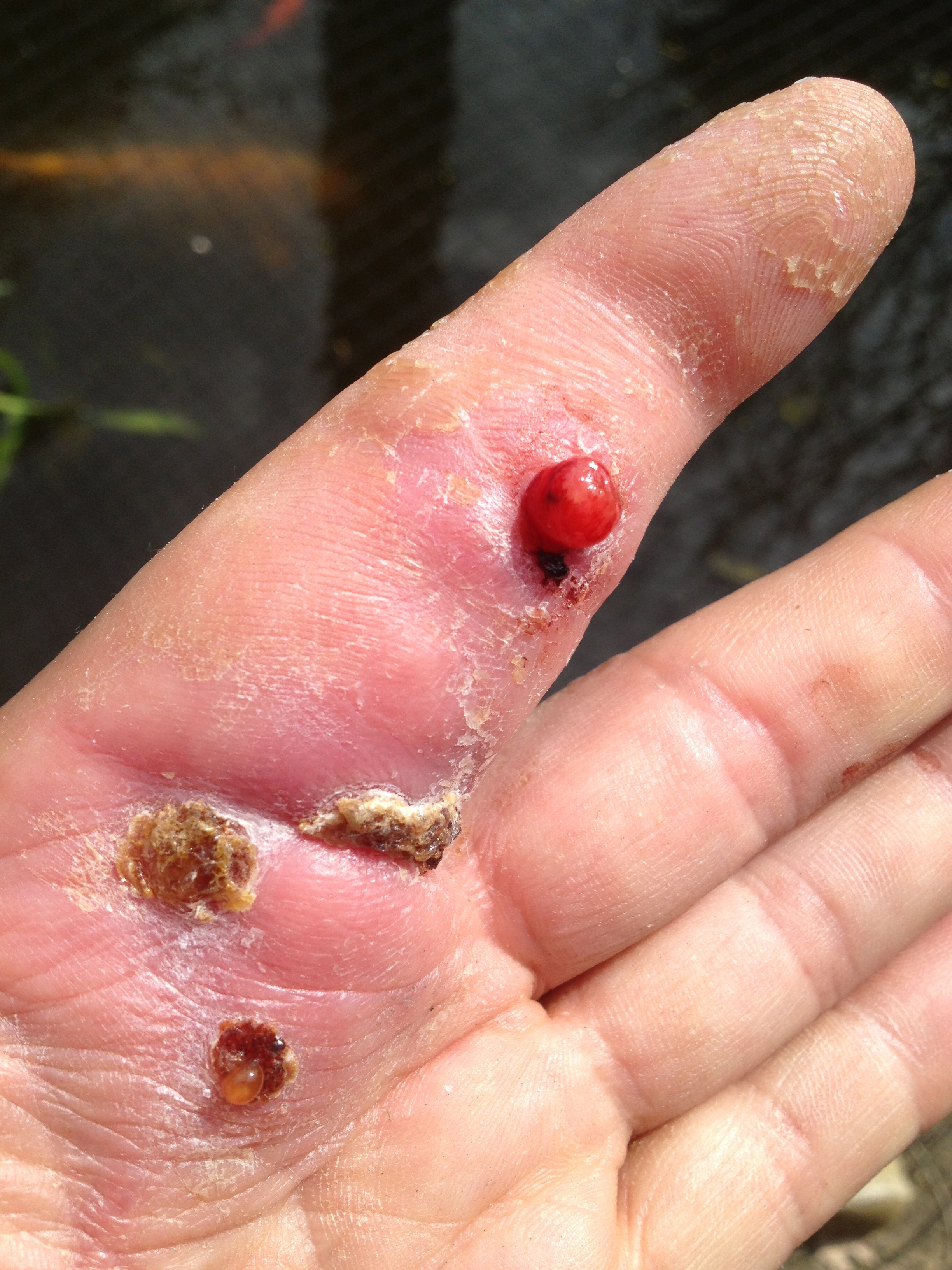 Here is the hand shortly after its holiday in France – you can’t fail to notice the exuding protrusion caused by accidentally catching the scab covering it on some shopping packaging, but otherwise getting better: